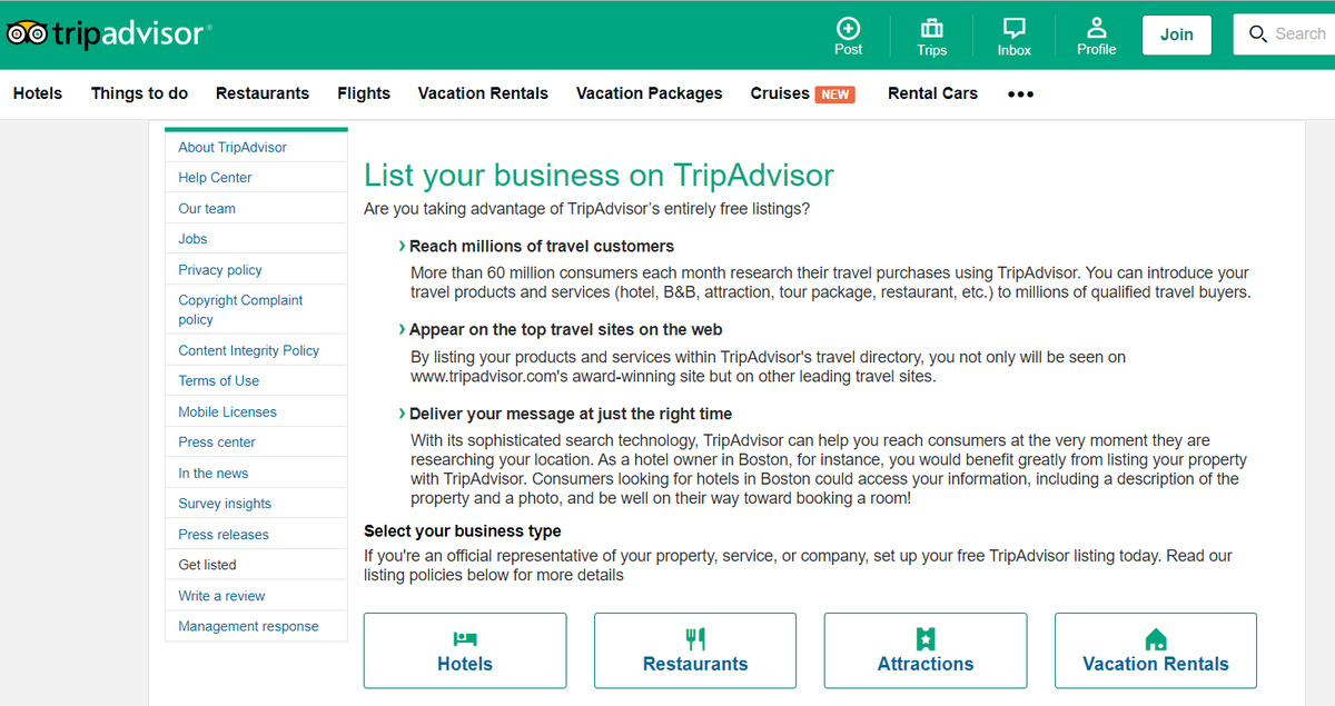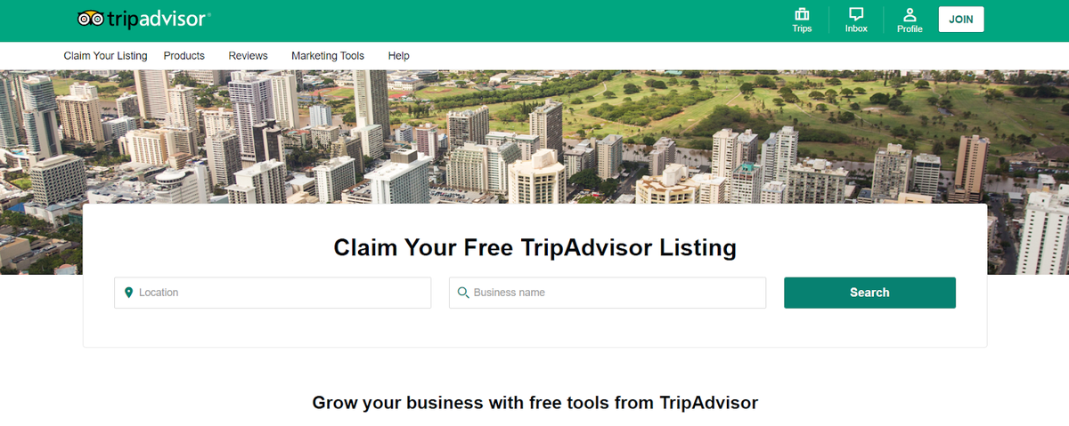 1) Un cliente puede comenzar su anuncio dejando un comentario sobre su negocio en el sitio web. Debe reclamar esta lista para administrarla y actualizarla. Simplemente encuentre su negocio en https://tripadvisor.com/owners. Si aparece en los resultados de búsqueda, seleccione el nombre de su empresa y haga clic en Reclamar su empresa.